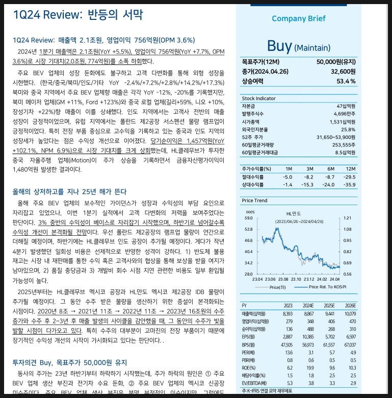 실제 HL만도의 24년 1분기 실적을 보면