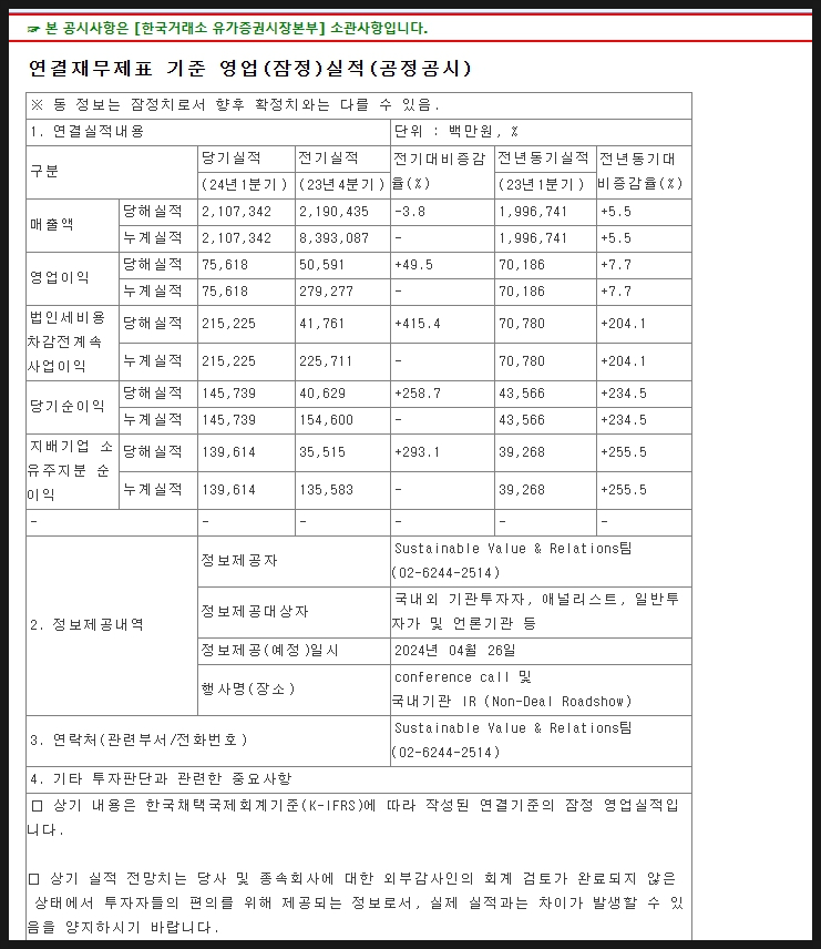 시장 기대치에 비해서 24년 1분기 실적이