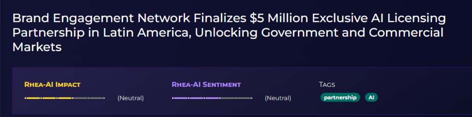 Brand Engagement Network(BNAI)가 라틴아메리카 AI 기업 SKYE Inteligencia LATAM과 5백만 달러 규모의 독점 AI 라이선스 계약을 체결했다.