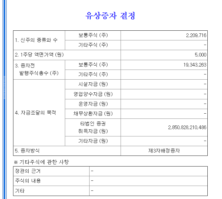 약 2.85조 원 규모의 제3자배정 유상증자를 결정했음.