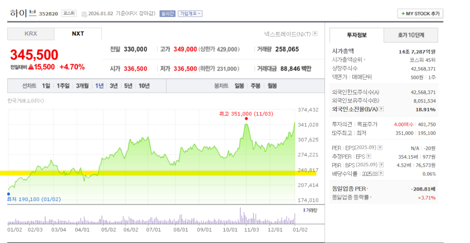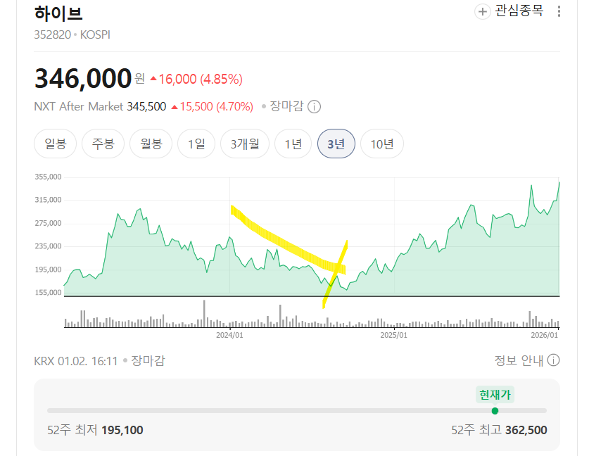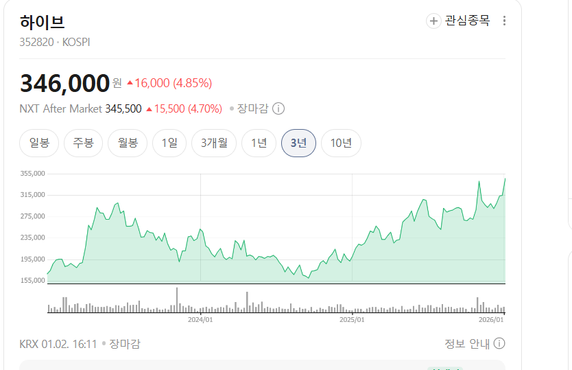1월 2일~3일 사이 하이브 주가는 약 5% 안팎 상승했습니다.