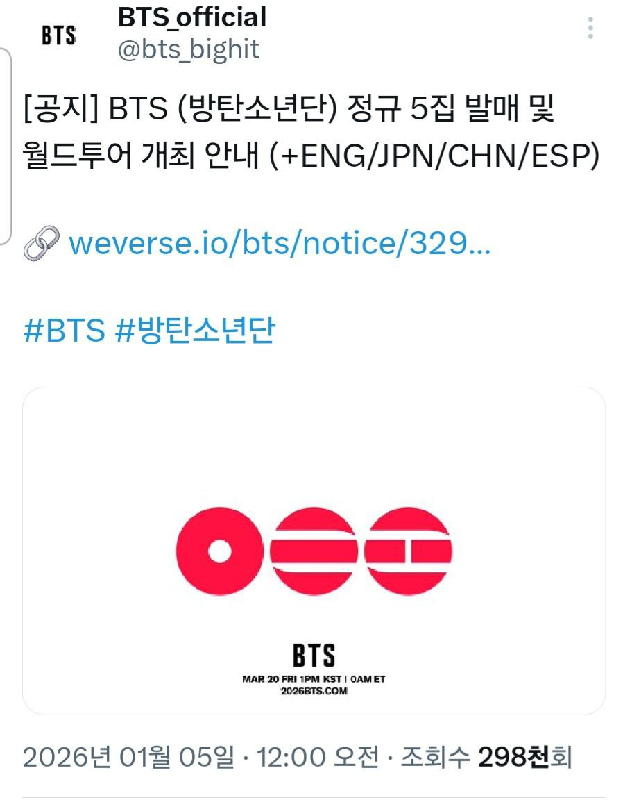 특히 3월 20일 BTS 정규 5집 발매 및 월드투어 계획이