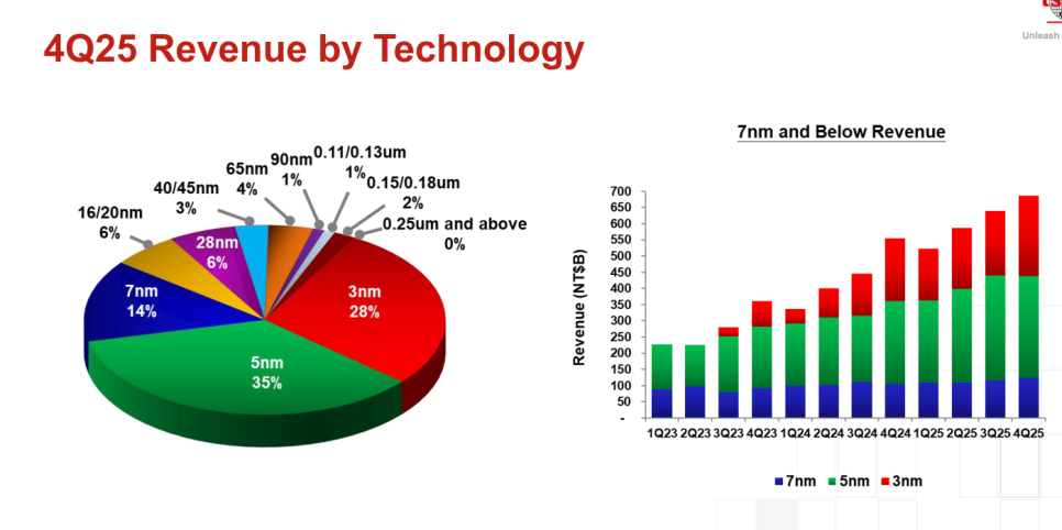 이 같은 수익성의 핵심은 매출의 77%가 7나노 이하 첨단 공정에서 발생하고 있다는 점이다. 이 구간은 AI 가속기, 데이터센터용 칩, 엔비디아·애플·AMD의 핵심 제품들이 사용하는 공정으로, TSMC의 실적이 AI 산업과 직접적으로 연결돼 있음을 의미한다. 특히 3나노와 5나노 매출이 빠르게 늘며 전체 성장을 이끌고 있다.