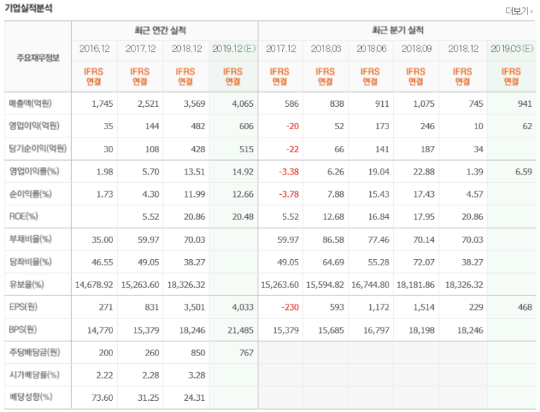 나무위키에서 현우진을 조사해서 약력에 추가된 부분을 살펴보면 '2018년 12월 19일부터 31일까지 겨우 열흘만에 21만권이라는 판매량을 기록했다' 그 전해 12월에 11만권 판매한 것과 비교하면 엄청나게 올라간 수치입니다. 그래서 19년 1분기도 18년 1분기에 비해서 실적향상이 계속 되리라 생각됩니다. 그것도 꾀 크게.. 작년 기준으로 per 11.7(시가총액 4811억)이라 그렇게 싸지는 않지만 올해 실적이 크게 향상될 것으로 봐서는 싸다고 생각합니다.
