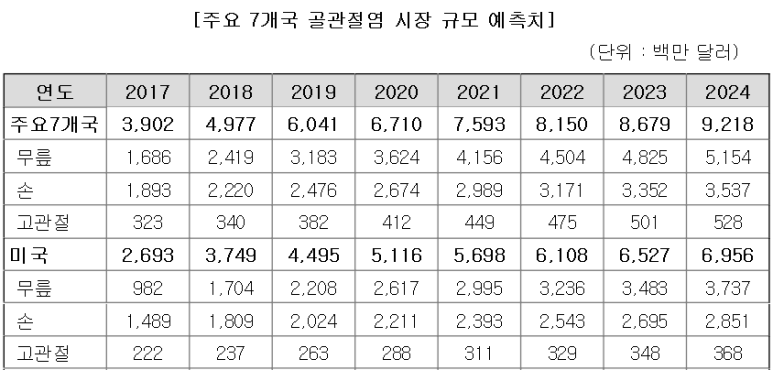 먼저 파이프라인을 보면 무릎 골관절염 대상 INVOSSA ™의 미국 임상 3상을 승인받고 시험 진행을 계획하고 있는 단계이고 나머지는 인보사의 적응증 확대 논의, 전임상 단계입니다. 따라서 현재는 무릎 골관절염만 보시면 됩니다. 무릎 골관절염 미국 시장의 크기는 아래와 같이 현재는 2조 9000억쯤이고 2024년엔 7조 7000억 정도로 예상되고 있습니다.