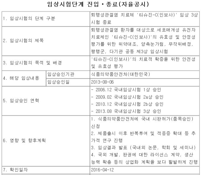 3. 코오롱생명과학 - 티슈진-C(인보사) 국내 임상 3상 시험 종료 공시