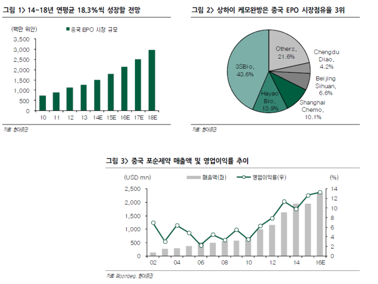 위 표들은 현대증권에서 나온 리포트를 잘라 옮긴 것입니다. 중국시장이 커져가고 있다는 점과 케모완방의 EPO점유율(3위)을 나타낸 그림입니다.