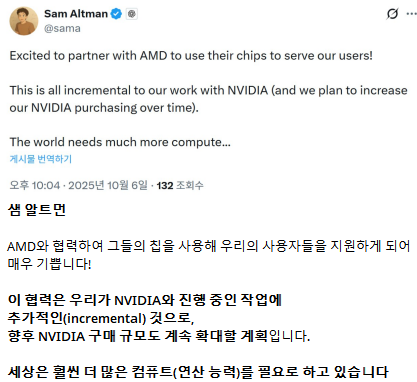 이번 파트너십은 AMD와 OpenAI 양사의 강점을 결합해, 세계에서 가장 야심찬 AI 인프라 구축을 이끌고 AI 생태계 전반의 성장을 촉진할 것입니다.”