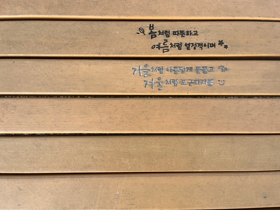 턱걸이 하다가 잠시 앉아 있으니, 바로 보이는 벤치에서 아름다운 글귀.