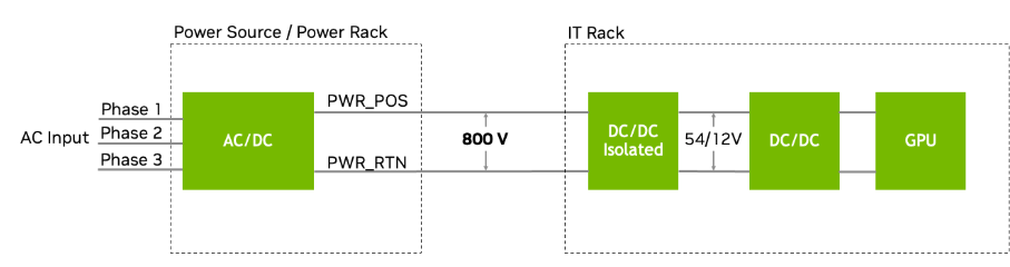 800V 전력을 직접 입력받는 방식으로 전환하면, 컴퓨팅 랙은 별도의 AC/DC 변환 단계를 거치지 않고도 효율적으로 전력을 공급받을 수 있습니다. 이 방식은 두 개의 전선으로 800V DC를 공급받아, 랙 내부에서 DC/DC 변환을 통해 GPU 등 장치에 필요한 전력을 제공합니다.