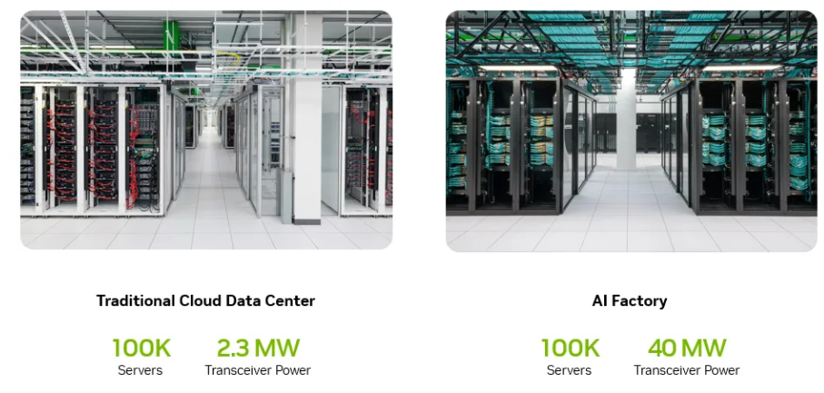 반면, NVIDIA가 주도하는 최신 AI 팩토리는 수천 개의 GPU가 하나의 작업을 위해 밀도 높게 협력하는 초고집적 컴퓨트 랙으로 구성됩니다. 이런 환경에선 데이터센터 전반에 걸쳐 최대한의 대역폭과 최소한의 지연이 필수인데, 이를 위해 랙 내부에 위치하던 Tier 1 스위치를 각 행(row) 끝으로 옮기는 새로운 토폴로지가 도입됐습니다. 이 아키텍처에서는 서버와 스위치 간 거리가 크게 늘어나면서 광 네트워킹이 반드시 필요해졌습니다. 그 결과, 전력 소비와 광학 부품 사용량이 크게 늘었고, 이제는 NIC와 스위치 간 연결은 물론, 스위치 간 연결에도 광학 장치가 요구됩니다.