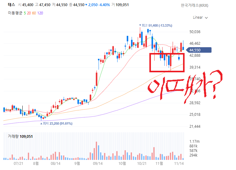 발기한 차트지만, 11/17 오전에 케이시텍과 테스를 급히 비교하고 우선 사고 싶은 물량의 절반정도에 대해서 3회정도 나누어서 매수하였다. (육아휴직의 축북이다. 회사에 있었다면, 주말에 결정을 하더라도, 두기업의 매영순, PER, ROE, 사업보고서를 아침에 간단히라도 보지는 못했을 것이다) 우선은 쳐물리고 시작하였다. 아래에 걸어두었는데, 방금 다시 체결이 되었다. 가동률이 상승한다면 CMP연마기업도 좋겠지만, 디램/낸드 골고루 진행하고 더 ROE가 좋은 테스를 선택하였다.