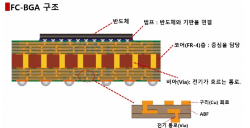 회로와 절연체를 한 쌍으로 봤을 때, FC-BGA는 현재 고단,적층으로 패키징회사로 공급됨.