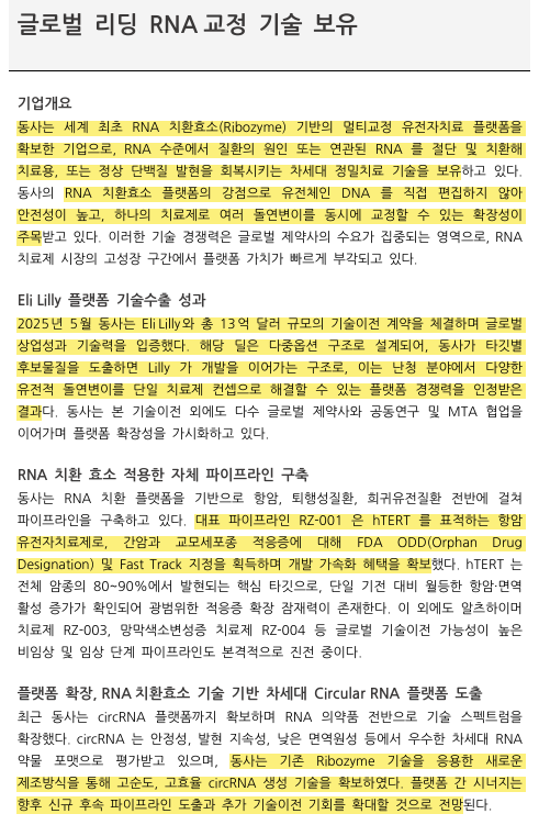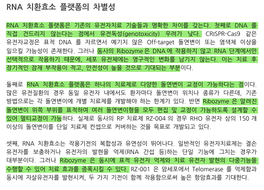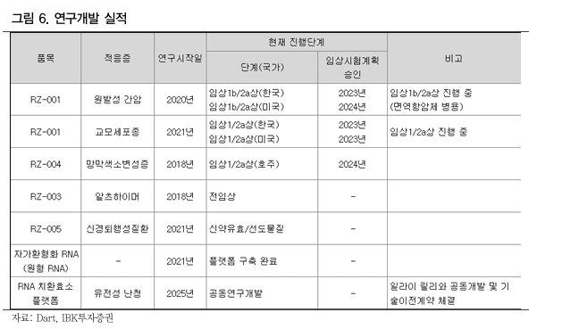 :RZ-001은 암세포에서 발현되는 텔로머라제의 핵심 요소인 hTERT(human telomerase reverse transcriptase) RNA를 표적하는 RNA 치환효소 기반 항암 유전자 치료제다. 아데노바이러스 5형(AAV5)을 전달체로 사용한다. 간세포암 적응증에서 RZ-001은 국내 식약처와 미국 FDA로부터 1차 치료제 약물 병용요법 임상 1b/2a상 승인을 받았으며, 병용 약물인 아테졸리주맙·베바시주맙은 로슈와 셀트리온으로부터 무상 공급받고 있다.
