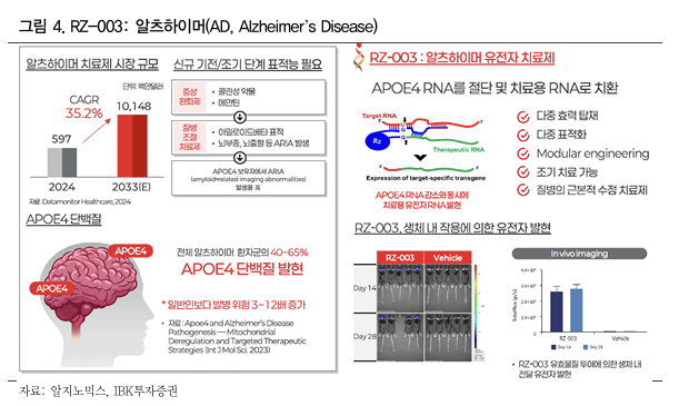 :RZ-003은 알츠하이머 질환의 주요 위험 인자인 아포지단백 E4(APOE4) 유전자의 RNA를 표적해 발현을 감소시키고, APOE2 또는 APOE3로 편집/교정해 치료 효과를 유도하는 RNA 기반 치료제다.