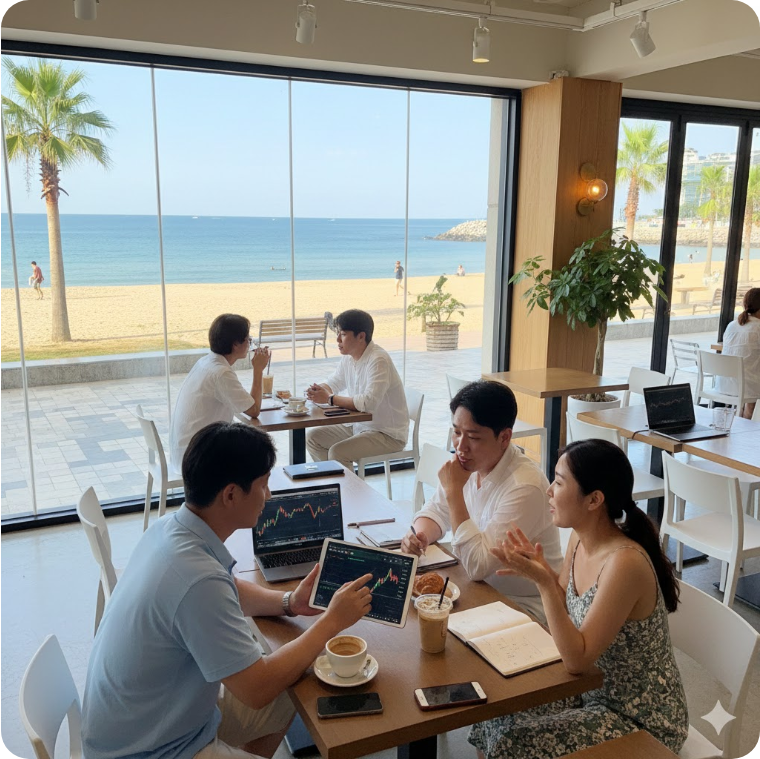 My Prompt : 주말아침 전망좋은 해운대 해변가 카페에서 주식투자를 이야기하는 사람들 모습을 그려줘