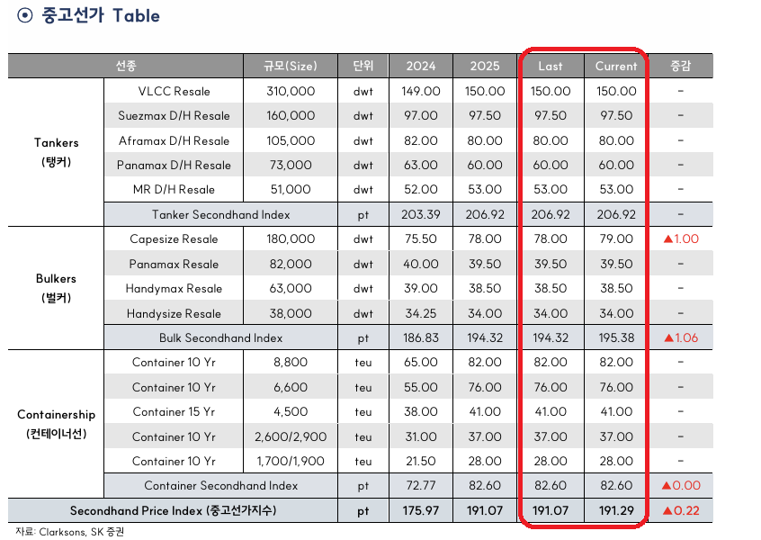 ▪ 신조선가지수는 185.59pt(+0.93pt), 중고선가지수는 191.29pt(+0.22pt)를 기록