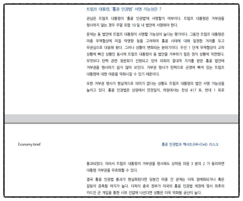홍콩인권법이 금융시장에 미칠 영향에 대한 분석 내용입니다.