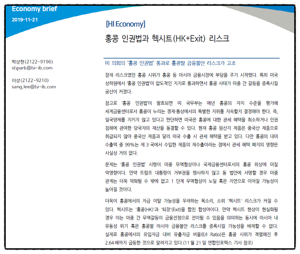 * 홍콩인권법과 헥시트 리스크 (하이투자증권)