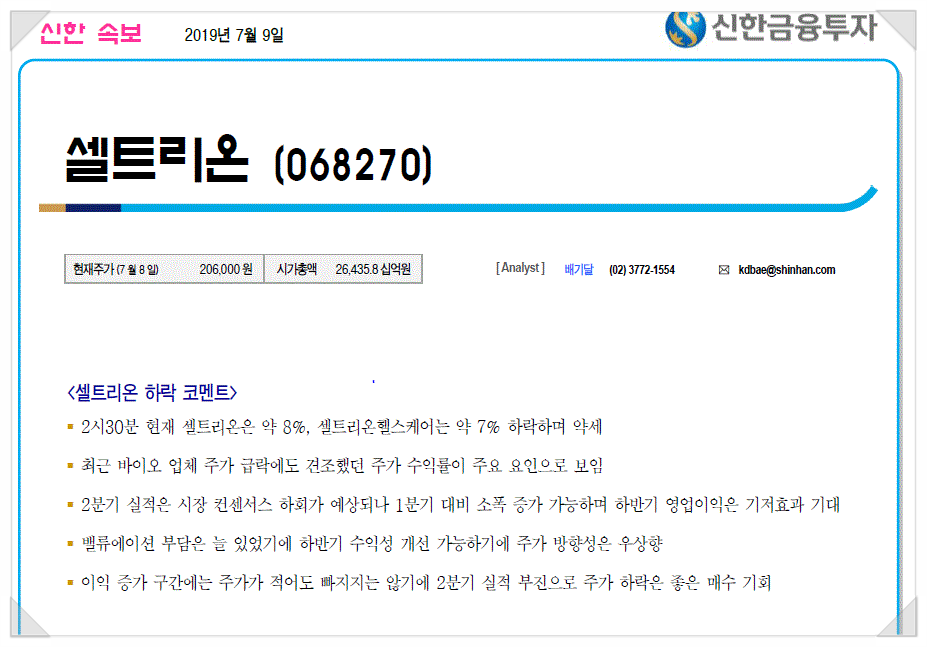 * 셀트리온, 금일 급락 원인은? (19.07.09)