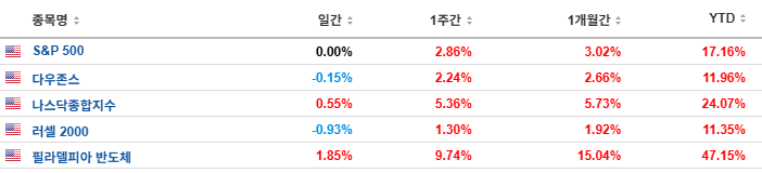 특히 관련 실적에 반도체 슈퍼사이클에 대한 기대로 마이크론(+2.13%)이 상승. 브로드컴(+3.49%), AMD(+2.45%), TSMC(+1.18%)도 상승.