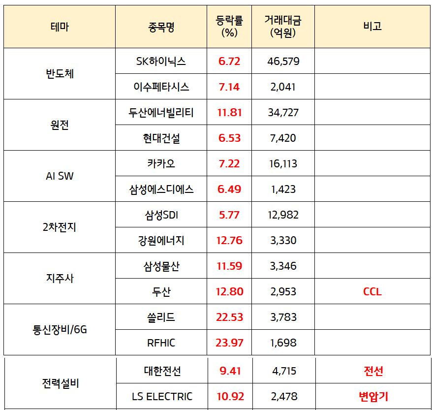 : 통신장비 / AI인프라 / 전자재료(CCL) / 지주사 / 반도체 / 전력설비 / 건설기계 / 2차전지(ESS) / 제약바이오