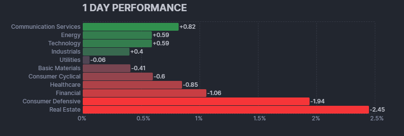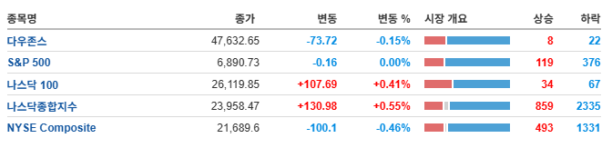 메타 플랫폼(+0.03%)는 예상을 상회했지만 EPS는 예상치인 6.71달러보다 부진한 1.05달러로 발표하자 8% 넘게 급락.