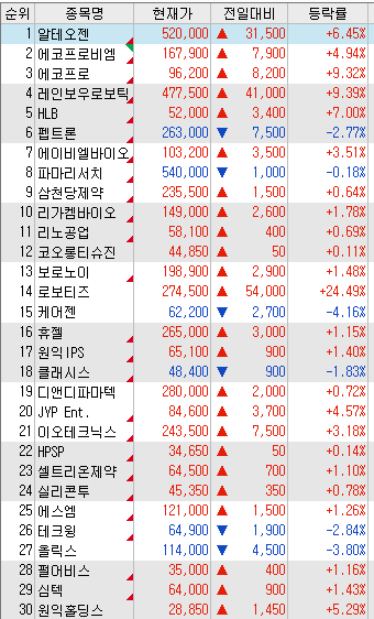 ▷방산 파이프라인 다변화 기대감 등에 방위산업/전쟁 및 테러 테마 상승.