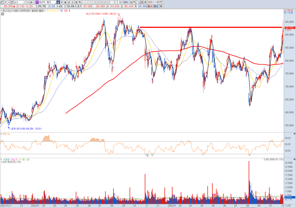 : 전일 일라이릴리 주가가 다시 52주 신고가를 터치하는 양호한 추세를 보임