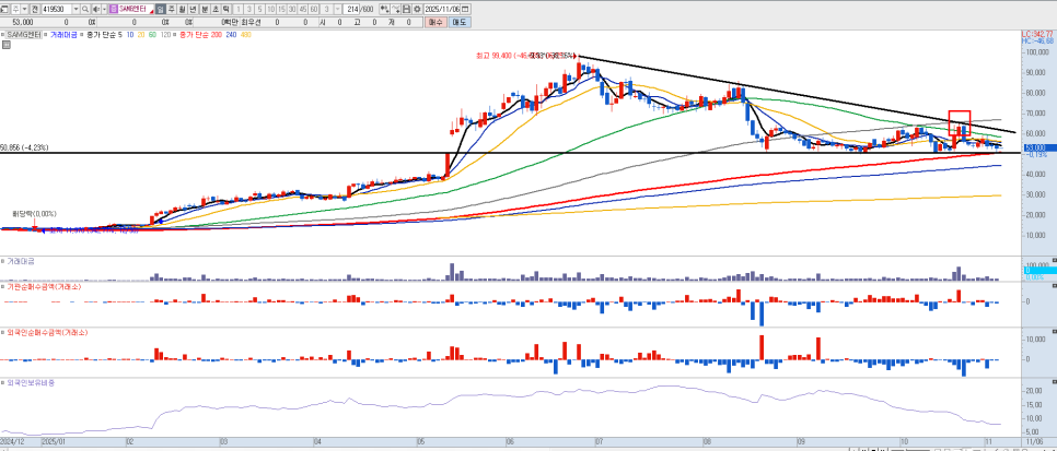상단 추세 저항선이 점차 낮아지고 있는 모습. 단기 매물들은 상당 부분 소화된 것으로 추측.