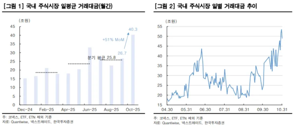 :10월 국내 주식시장 일평균 거래대금은 40.3조원으로 전월대비 51% 증가