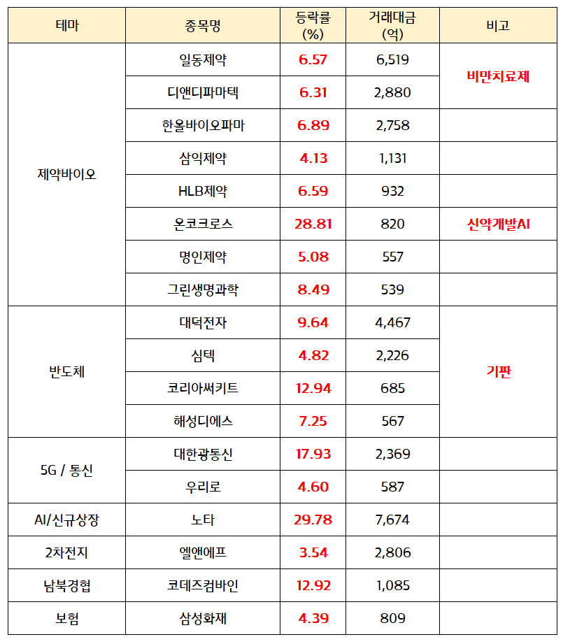 : 제약바이오(비만치료제) / 반도체, 기판 / 통신장비