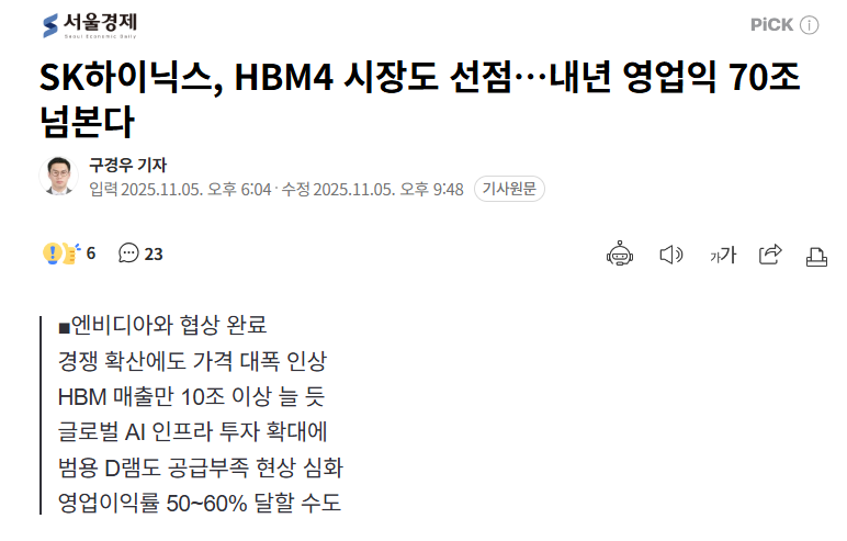 : HBM4에서 수익성을 확보한 SK하이닉스의 내년 영업이익이 70조 원을 돌파할 것이라는 전망