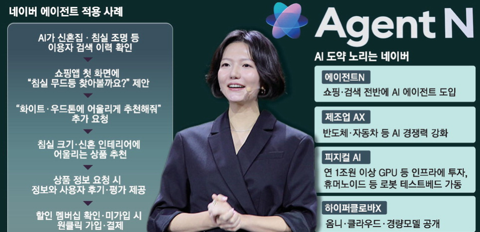 네이버는 통합 콘퍼런스 '단(DAN) 25'를 열고 쇼핑과 검색 전반에 AI 에이전트를 적용하고 반도체·자동차·조선을 비롯한 국내 핵심 제조업에 AI 솔루션을 도입하는 것을 골자로 하는 미래 AI 전략을 공개