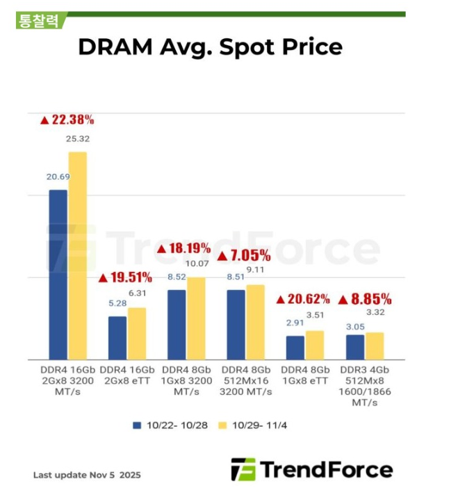 트렌드포스에 따르면 이번 주(10월29일~11월4일) DDR5 칩의 가격은 전주 대비 30% 급등했다.