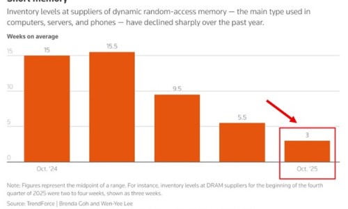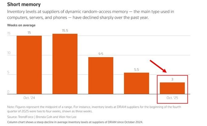 The AI boom is creating a severe memory chip shortage: Dynamic random-access memory (DRAM) inventory levels are down -80% YoY, to just 3 weeks worth of supply. This is the type of memory particularly used in computers and phones. By comparison, DRAM suppliers held ~9.5 weeks