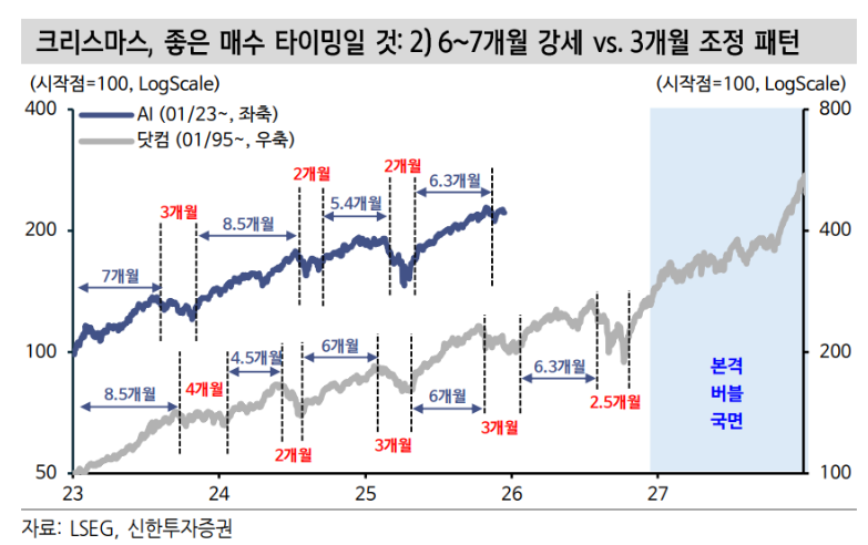 : 강세와 약세가 반복되는 패턴도 주목. AI와 닷컴 사이클의 주가 패턴은 상당히 유사한데, 강세장 말미로 진입하기 전까진 강세 6~7개월과 조정(=신고가 재경신) 3개월이 일정한 간격으로 반복된다는 점