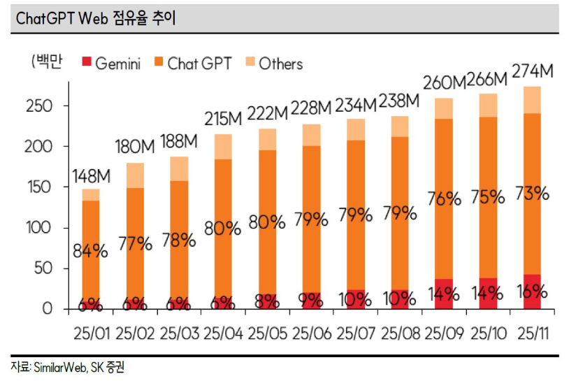 제미나이가 빠르게 올라고고 있지만 아직 GPT 점유율은 73% 수준