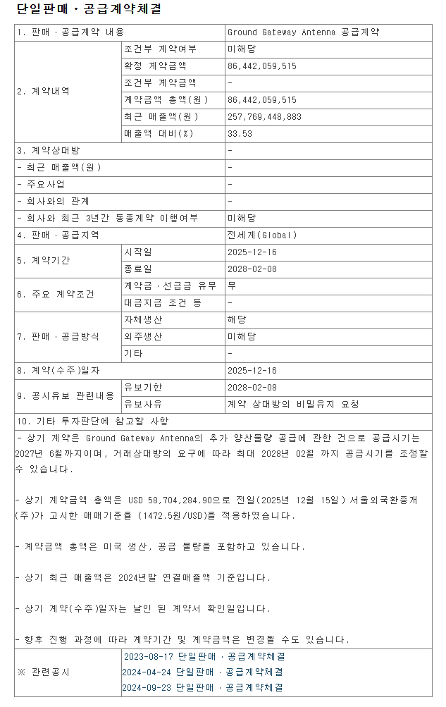 계약상대방은 비밀. 아마존 카이퍼 프로젝트향인 것으로 추정.