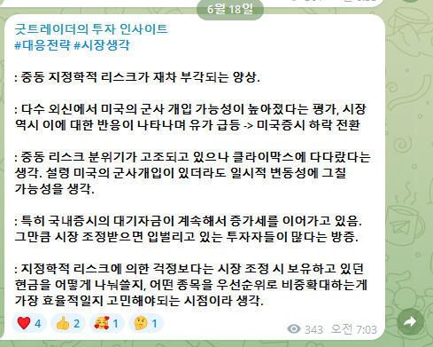 -> 매일 새벽 4시에 기상하여 간 밤의 주요 내용들을 수집 후 돈이 되는 핵심 내용들만 전달 드립니다.