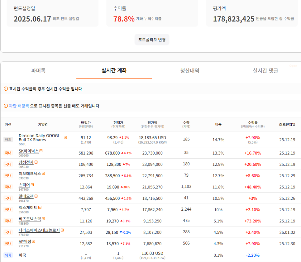 현재 25.06.17부터 시작한 포트폴리오는 +78.8%의 수익률을 기록 중입니다.