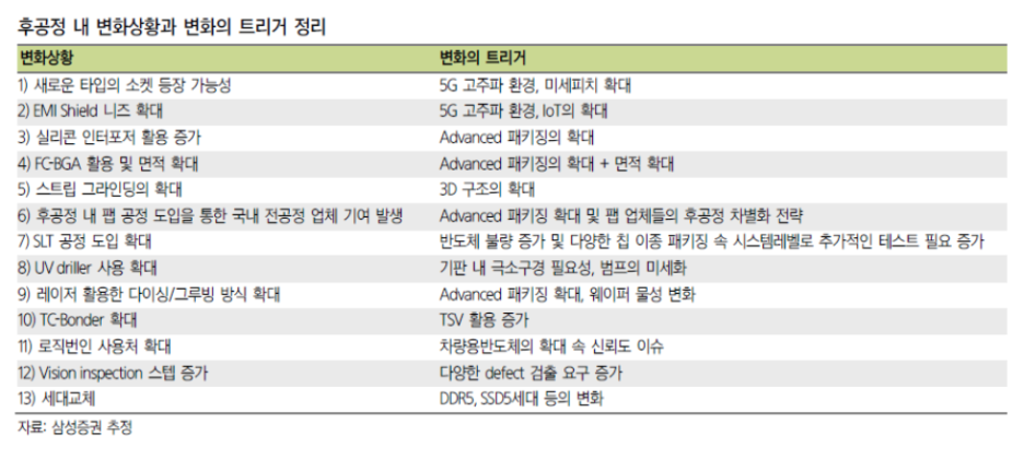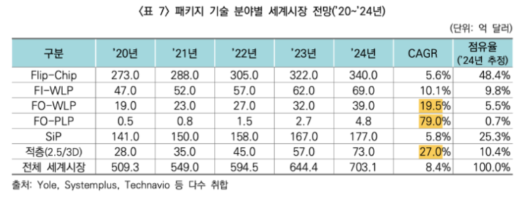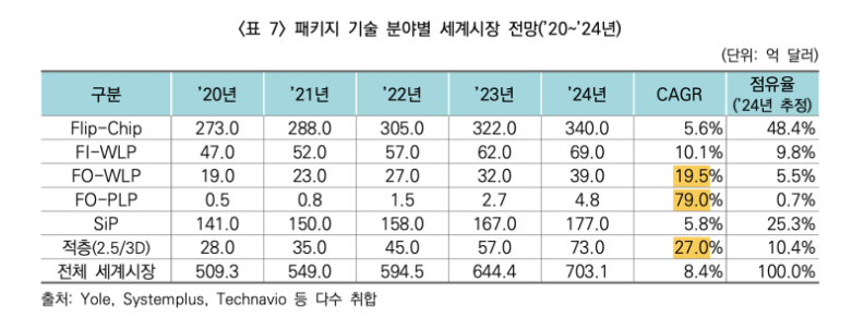 FOWLP와 FOPLP도 성장력이 뛰어난 차세대 패키징이다. 전술했다시피 이 2개는 패키지섭스트레이트라는 개념이 아니라, RDL을 형성한 웨이퍼로 패키징하는 것이다. 아직까지 TSMC를 위주로 시장이 돌아가고 있지만, 삼전의 FOPLP가 진척되면 여러 제품군에 적용될 가능성이 높다. 또한 2.5D 및 3D 패키징과 가격 경쟁을 하며 서로의 영역을 침범할 것으로 전망된다.