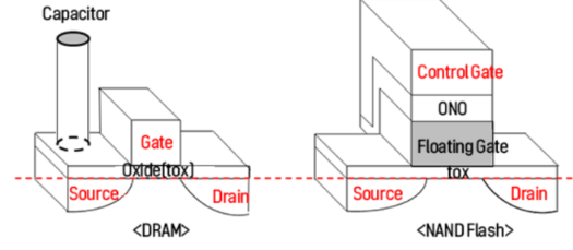 D램의 스택형: 실리콘 기판 위에 3차원 구조의 캐패시터를 쌓아 올리는 구조. 이걸로 삼전이 D램시장을 선두하였다.