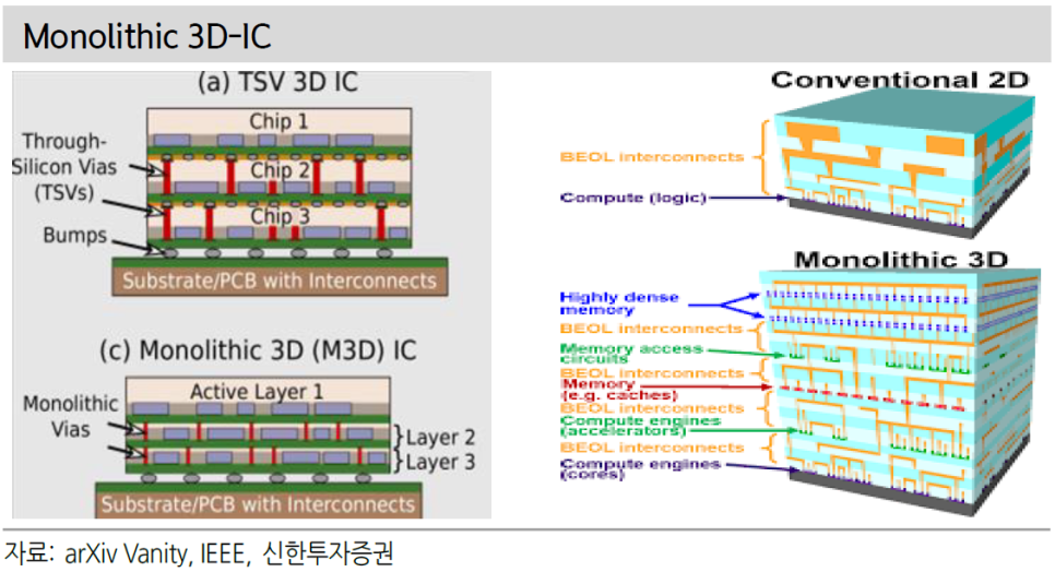 <Monolithic 3D-IC>: 후공정단에서 칩들을 배열하는 것이 아니라, 반도체 다이가 패키징 되기 전에 수직 적층하는 구조이다. 3D NAND 구조에서 서로 다른 종류의 다이들이 쌓인다고 보면 되고 후공정 기술들을 전공정에 도입하는 느낌이다. 그렇기 때문에 사실 패키징 기술은 아니지만, 이 기술이 실현되면 이종접합 패키징 시장이 다시 한번 뒤집힐 것으로 전망된다