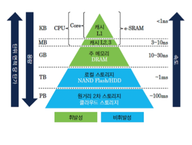 HDD: 하드 디스크 드라이브. 비휘발성 데이터 저장소로 대중적이고 가격이 저렴하다. 자기장의 원리로 동작하기 때문에 반도체가 아니다.