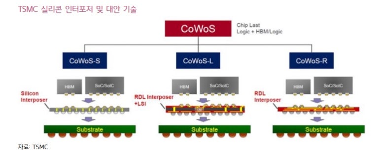 CoWoS: FCBGA에 인터포저를 FC본딩하고 위에 칩을 FC본딩하는 방식이다. 인터포저의 형태에 따라 시리즈가 나눠진다.