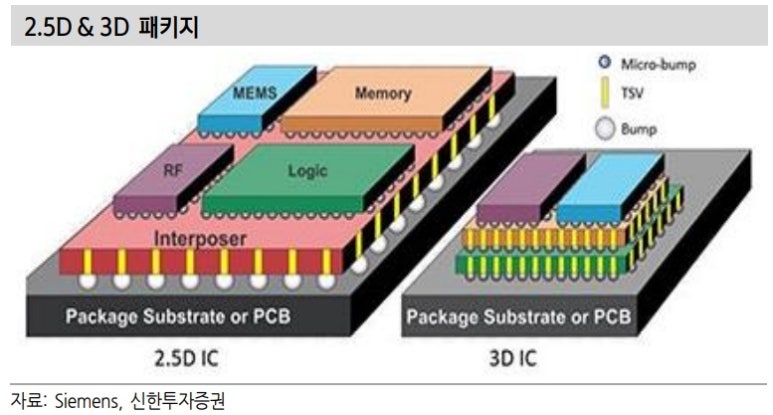 <2.5D 패키지>: 반도체 다이를 수평으로 접합한 패키징 기술이다. I/O밀도 차이가 있어 대부분 인터포저 채용이 불가피하다.