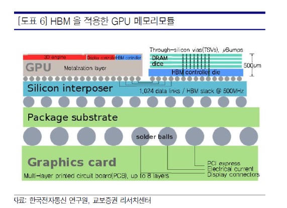 HBM은 D램을 적층하여 만든 새로운 고대역폭 D램이다. 처음부터 GDDR의 자리를 타겟하여 개발되었기 때문에 따로 모듈 형태로 나오지 않고, 로직반도체와 같이 패키징되어 출시되고 있다. HBM도 차세대 패키징을 이용하여 만든 제품으로 TSV기술과 인터포저가 핵심이다.