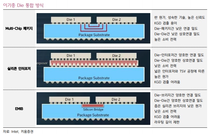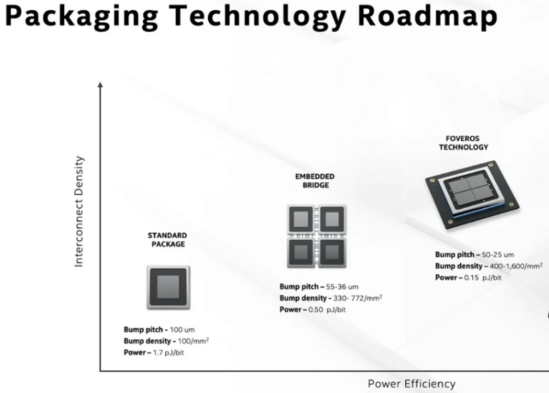 EMIB: 다이와 다이를 실리콘 인터포저로 연결하는데, 실리콘 인터포저를 FCBGA 기판에 내장한다. 이것을 실리콘 브리지라고 한다. 내장되어 있어 TSV공정이 덜 필요하다. 범프 피치는 36~55㎛이다.