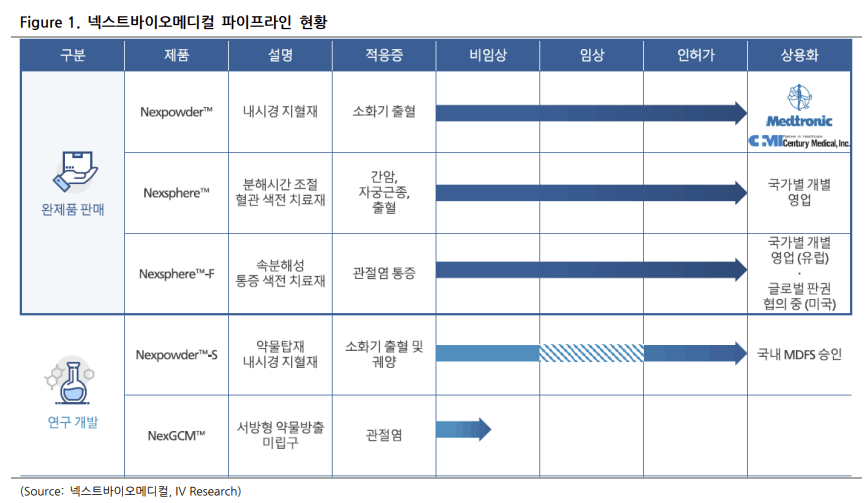 넥스파우더는 세계 최초로 출혈 예방까지 가능한 내시경용 분말 지혈제로, 위장관 출혈 치료의 새로운 패러다임을 제시하며 기존 지혈법의 한계를 극복했다. 한국 및 미국 임상에서 유의미한 재출혈률 감소 효과와 높은 안전성이 입증되었고, 메드트로닉과의 글로벌 판권 계약을 통해 미국 FDA, 일본 PMDA 승인 및 보험등재 등 주요 시장 진입 기반을 마련했다. 특히 기존 제품과 달리 비접촉식 분사, 강력한 부착력, 약물 탑재 가능성 등 기술적 차별성이 뚜렷하며, 예방적 사용의 임상적 근거도 확보되어 있다. 글로벌 시장 확대와 더불어 차세대 제품 넥스파우더-S 개발을 통해 동사의 장기 성장 축으로 자리잡을 전망이다.